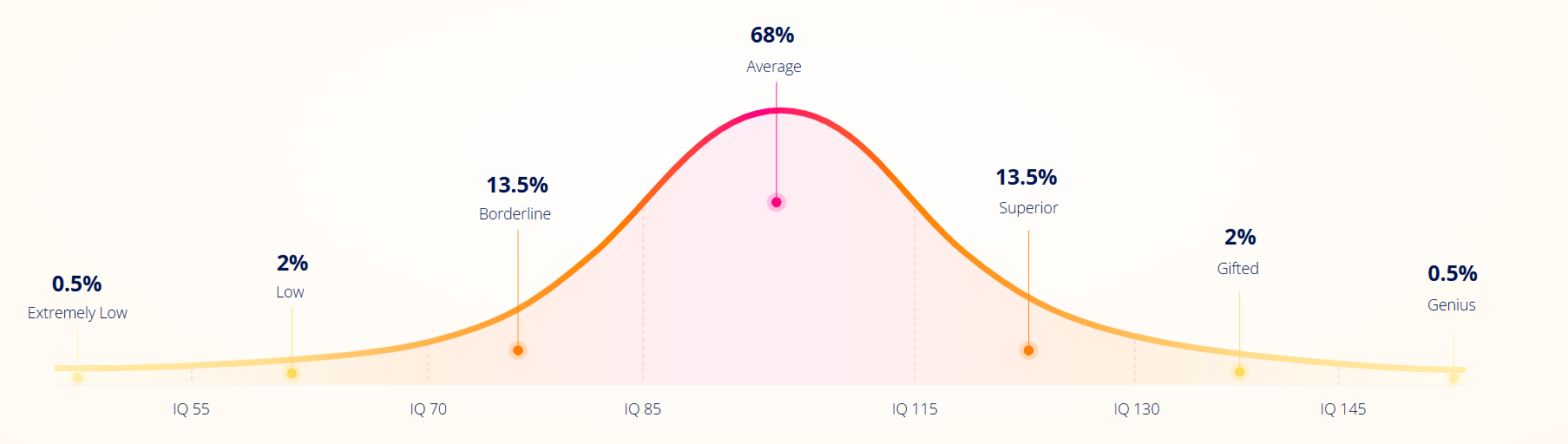 Bell curve is a visual representation of IQ levels with a standard deviation of 15 from the mean. It shows the proportion of people with each IQ level in the entire population. For instance, 68% of the population are classified as (Average) with IQ score in the 85 – 115 range. However, only 0.5% of the population are classified as (Genius) and have an IQ score above 145.